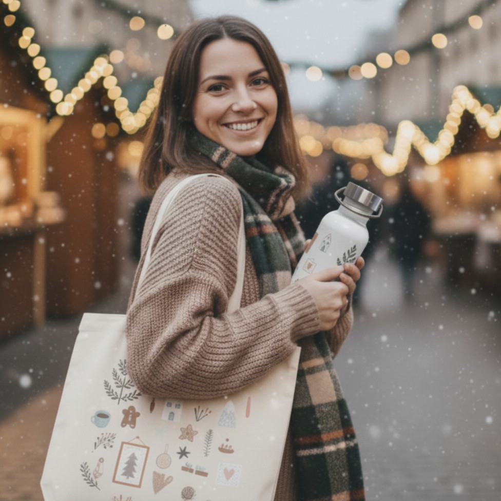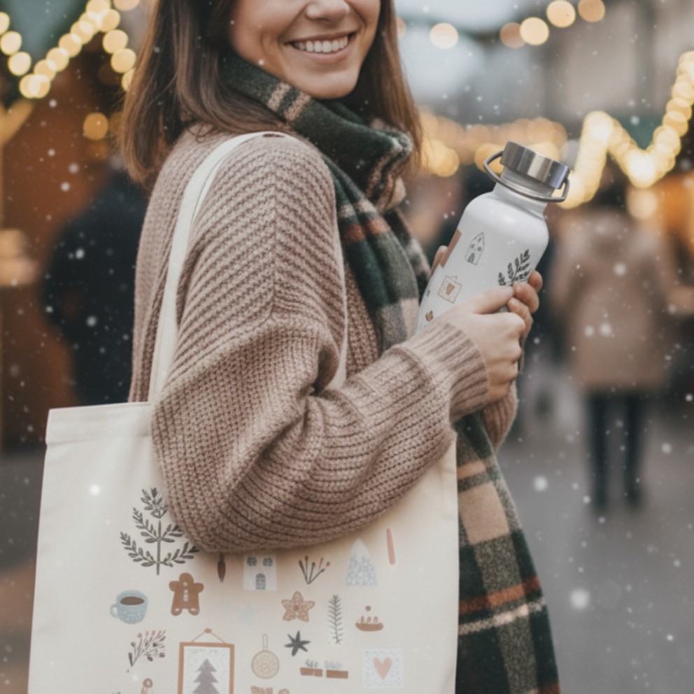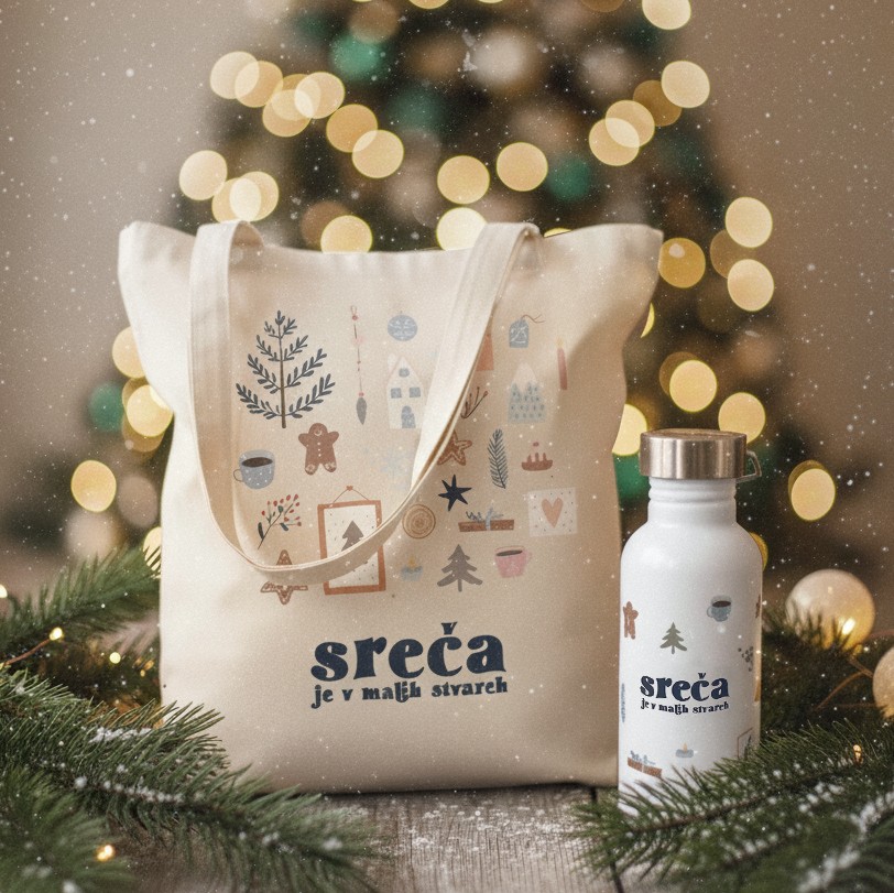 Platnena nakupovalna vrečka z božičnim potiskom in napisom "sreča je v malih stvareh" z dolgimi ročaji in razširjenim dnom. Trpežna, prostorna in udobna za nošenje (38 × 9 × 42 cm). Krasna izbira za praznično obdarovanje!