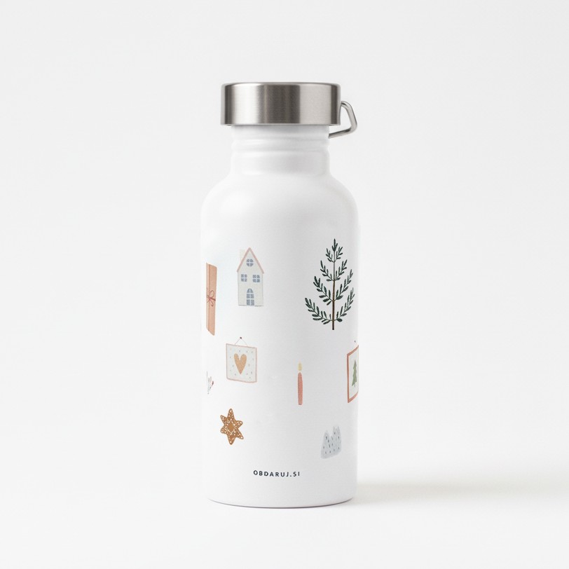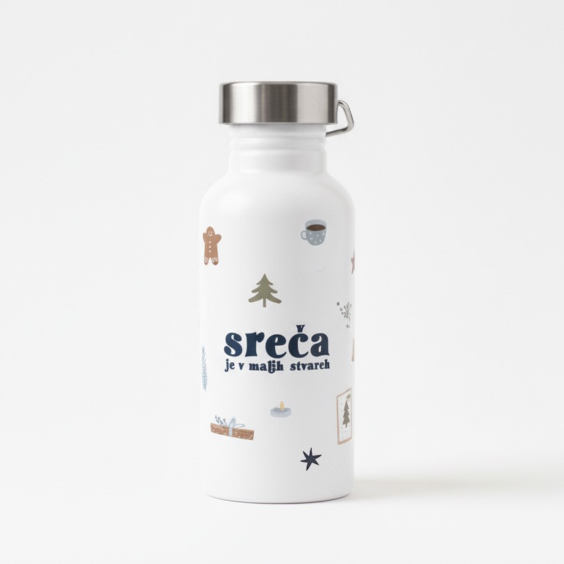 Steklenička bele barve s prazničnim potiskom in napisom "sreča je v malih stvareh" je izdelana iz recikliranega nerjavečega jekla, ima pokrovček na navoj in priročen ročaj. Prostornina 500 ml. Popolna izbira za praznično darilo – trajnostna, okolju prijazna in hkrati polna prazničnega vzdušja!